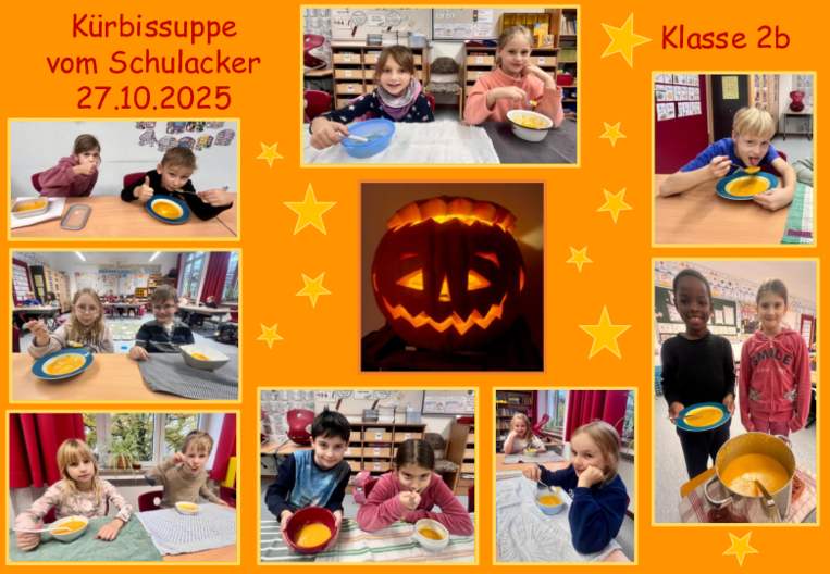 In diesem Schuljahr gab es wieder eine reichhaltige Ernte auf unserem Schulacker. Netterweise gaben die Kinder der Klassen 4a und 4b an jede Klasse einen großen Speisekürbis ab. Am 27.10.2025 gab es deshalb in der Klasse 2b eine leckere Kürbissuppe, die bei den Kindern sehr großen Anklang fand. Beim Haupteingang begrüßt nun der geschnitzte Kürbis die Schülerinnen und Schüler in der Woche vor Halloween mit einem fröhlichen Lächeln.
