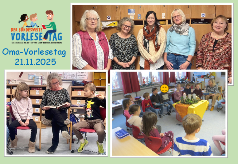 Anlässlich des bundesweiten Vorlesetages wurden in allen Klassen Omas zum Vorlesen eingeladen. Begeistert lauschten die Kinder den spannenden Geschichten. Im Anschluss wurden die fleißigen Omas mit Kaffee und Kuchen im Lehrerzimmer belohnt.