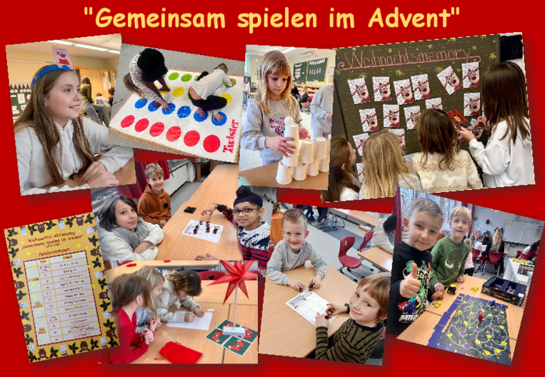 Danach standen für alle Kinder und Eltern zwölf abwechslungsreiche Spielestationen bereit: beispielsweise mit dem weihnachtlichen Lehrermemory, Weihnachts-Activity, Weihnachts-Twister, Brettspielen zum Mitmachen und Basteln und sportlichen Winter-Würfelaufgaben verging die gemeinsame Spielezeit wie im Flug.
