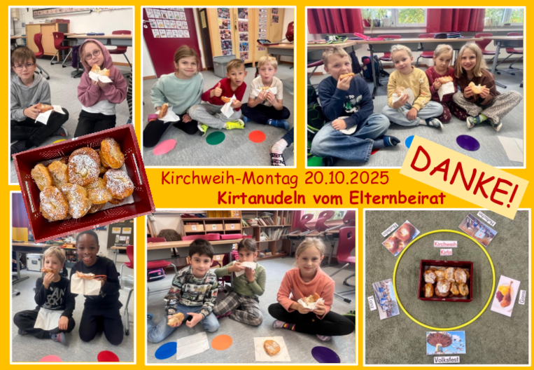 Am Kirchweihmontag spendierte uns der Elternbeirat Kirtanudeln in Form von leckeren Donuts. Auf verschiedene Art und Weise wurde allen unseren Schulkindern das Thema "Kirchweih" näher gebracht, als Höhepunkt gab es dann das feine Festtagsgebäck. Ein herzliches Dankeschön an unseren Elternbeirtat!