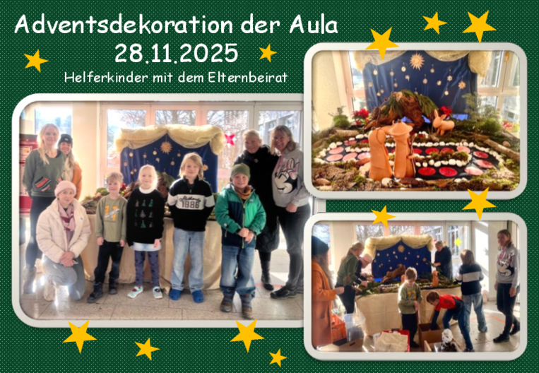 Viele fleißige Helferinnen unseres Elternbeirats haben gemeinsam unsere Schulaula adventlich geschmückt. In einer großen Naturkrippe werden Maria und Josef jeden Tag einen kleinen Schritt weiter in Richtung Weihnachtskrippe wandern. Außerdem leuchtet in der Aula unser großer Adventskranz, jede Woche eine Kerze mehr. Für alle Klassen werden vom Elternbeirat prächtige Adventskränze bereitgestellt, die die weihnachtliche Stimmung auch in die Klassenzimmer tragen.
