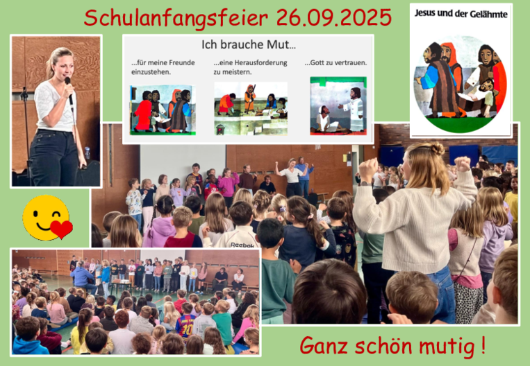 Gemeinsam wurden am 26.09.2025 der Start ins neue Schuljahr gefeiert und die neuen Erstklässller begrüßt. In der Turnhalle erklangen fröhliche Mitmach-Lieder, die Kinder lauschten der Geschichte von "Jesus und der Gelähmte" und dachten über das "mutig Sein" nach. Es wurde getanzt, gesungen und gelacht und die erste gemeinsame Feier in der Turnhalle ging allzuschnell vorbei.
