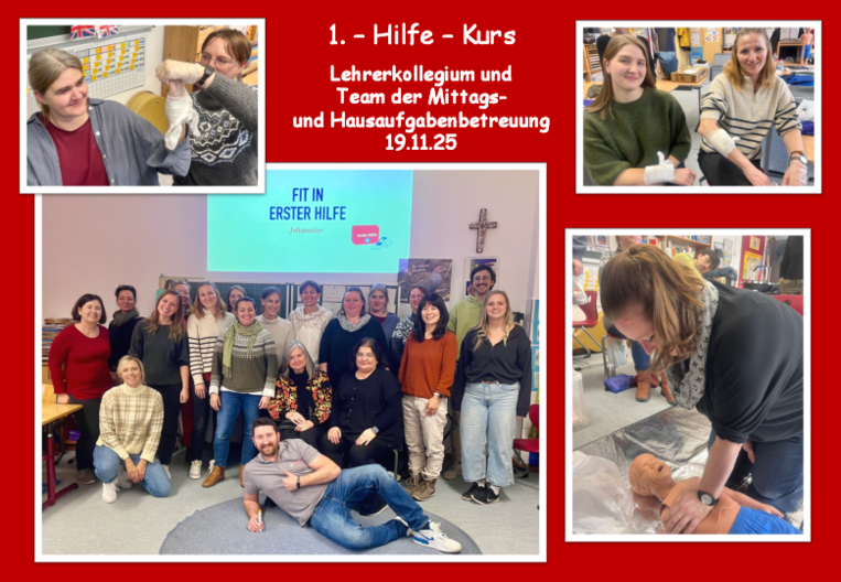 Um für den Fall der Fälle gut gerüstet zu sein, nahm das Team der Mittags- und Hausaufgabenbetreuung gemeinsam mit dem Lehrerkollegium am unterrichtsfreien Buß- und Bettag an einem ganztägigem Erste-Hilfe Kurs der Johanniter teil. Dabei wurden die Grundkenntnisse als Ersthelfer beim Verbinden, bei der Herz-Druckmassage und der richtige Einsatz eines Defibrilators ausführlich erklärt und geübt. Auch über die richtigen Maßnahmen bei Verbrennungen, Nasenbluten, Schlaganfall, Herzinfarkt, Asthma, Vergiftungen oder bei der Gefahr des Erstickens wurde informiert. Alle waren sich am Ende einig, dass der Kurs die notwendige Sicherheit für einen medizinischen Notfall in der Schule gibt, dass aber alle gleichermaßen hoffen, dass sie ihr aufgefrischtes Erste-Hilfe-Wissen nicht so rasch anwenden müssen.