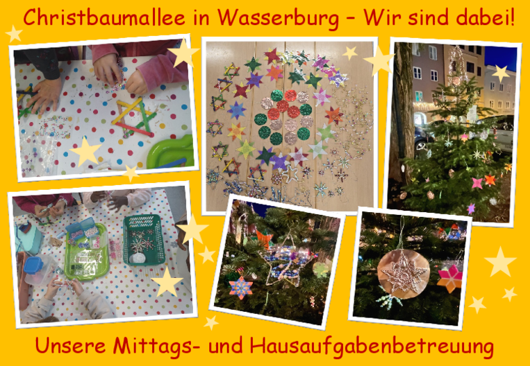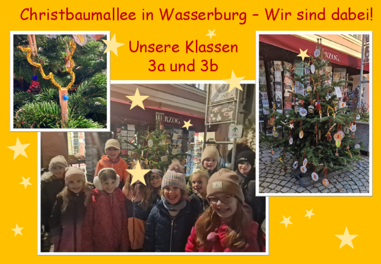 Auch in diesem Schuljahr beteiligt sich die Grundschule Reitmehring wieder an der Christbaumallee in der Wasserburger Altstadt. In den 3. Klassen und in der Mittags- und Hausaufgabenbetreuung bastelten und malten die Kinder mit großem Eifer kleine Kunstwerke, die alle einen liebevoll ausgewählten Platz am Christbaum fanden. Bis Weihnachten kann das Prachtexemplar der Klassen 3a und 3b vor der Buchhandlung Herzog, der strahlende Baum der Mittags- und Hausaufgabenbetreuung vor der Eisdiele in der Ledererzeile bewundert werden.