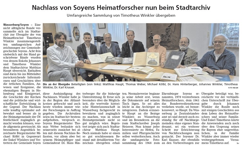 Im Oktober 2025 wurde der schriftliche Nachlass des Soyener Heimatforschers Timotheus Winkler dem Stadtarchiv übereignet.